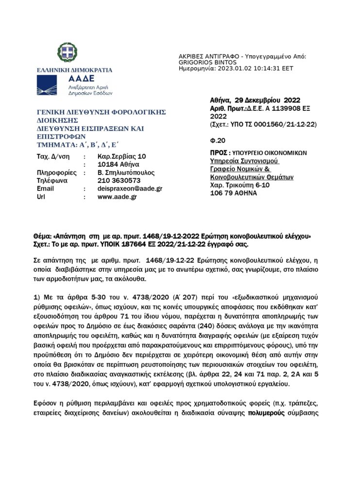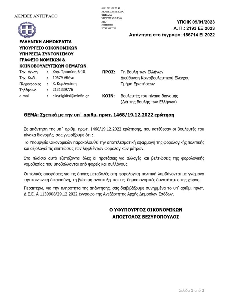 Στις 9 Ιανουαρίου 2023, λάβαμε την υπ’αριθμ. 2193/2023 απάντηση, την οποία υπογράφει ο Υφ.Οικονομικών κ.Απόστολος Βεσυρόπουλος. Δυστυχώς, φαίνεται ξανά πως η κυβέρνηση σφυρίζει αδιάφορα, αφήνοντας τους συμπολίτες μας στο έλεος της οικονομικής και υγειονομικής κρίσης. Στην μονοσέλιδη απάντηση του, ο Υφυπουργός αναφέρει πως «Tο Υπουργείο Οικονομικών παρακολουθεί την αποτελεσματική εφαρμογή της φορολογικής πολιτικής και αξιολογεί τις επιπτώσεις των ληφθέντων φορολογικών μέτρων.», χωρίς να γίνεται καμία αναφορά για το εάν υπάρχει πρόθεση επαναφοράς της δυνατότητας ρύθμισης των οφειλών σε 120 δόσεις ή σε άλλο αριθμό δόσεων.