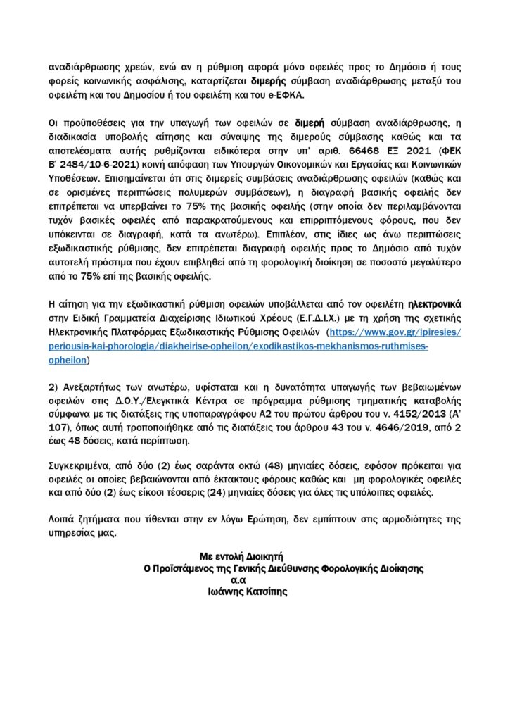 Άμεσα το Υπουργείο θα πρέπει να μεριμνήσει προκειμένου να επανέλθει η δυνατότητα ρύθμισης των οφειλών σε 120 δόσεις, με κούρεμα των οφειλών της πανδημίας, ώστε να δοθεί μια ανάσα στους συμπολίτες μας.
