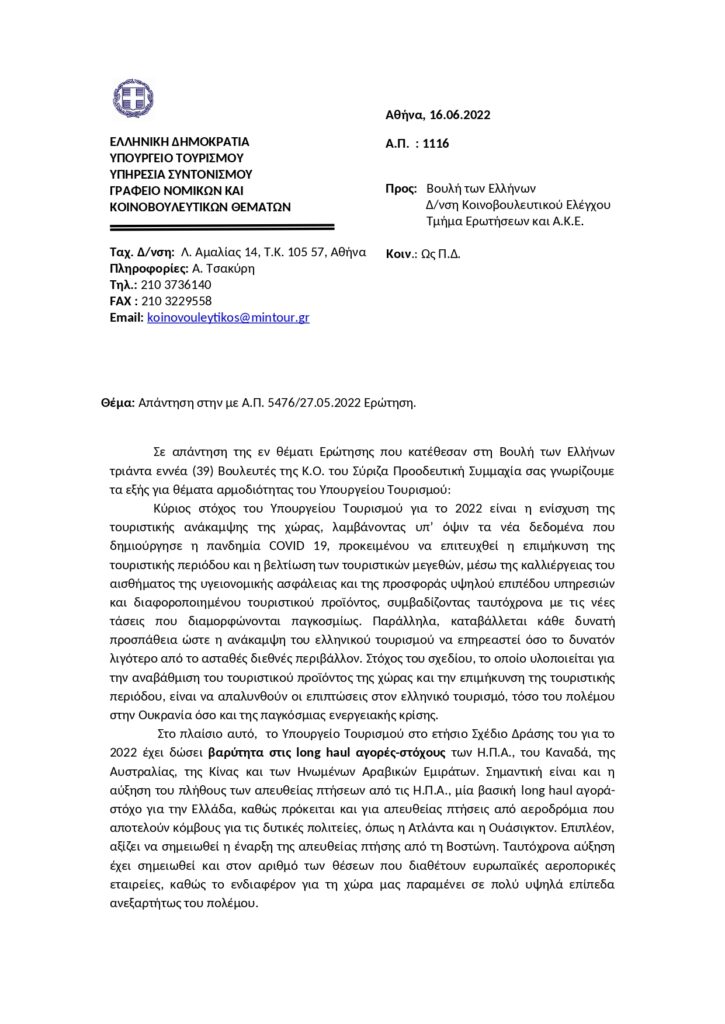 Ύστερα από την ερώτηση, μας απεστάλη η υπ’αριθμ. 1116 /2021 Απάντηση, την οποία υπογράφει ο Υπουργός Τουρισμού. Το Υπουργείο έριξε για άλλη μια φορά τις ευθύνες στις διεθνείς εξελίξεις και επέλεξε να κάνει μόνο γενικές αναφορές στο ότι επιθυμεί να στηρίξει (;;) το τουριστικό προϊόν της χώρας μας. Προτάσεις και παραδείγματα λύσεων υπάρχουν, ωστόσο η κυβέρνηση επιλέγει ως συνήθως την οδό της αδιαφορίας. Δυστυχώς, παραμένουν τα εύλογα ερωτηματικά για το πως θα αντιμετωπισθεί το πρόβλημα της ακρίβειας των καυσίμων στα νησιά, όπου οι υψηλές τιμές λειτουργούν αποτρεπτικά για την περαιτέρω τουριστική κίνηση ενώ αυξάνουν σημαντικά το καθημερινό κόστος ζωής για τους νησιώτες.